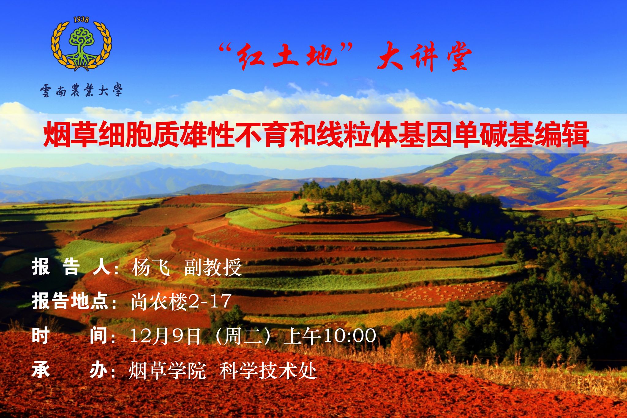 12月9日“紅土地”大講堂:煙草細(xì)胞質(zhì)雄性不育和線粒體基因單堿基編輯