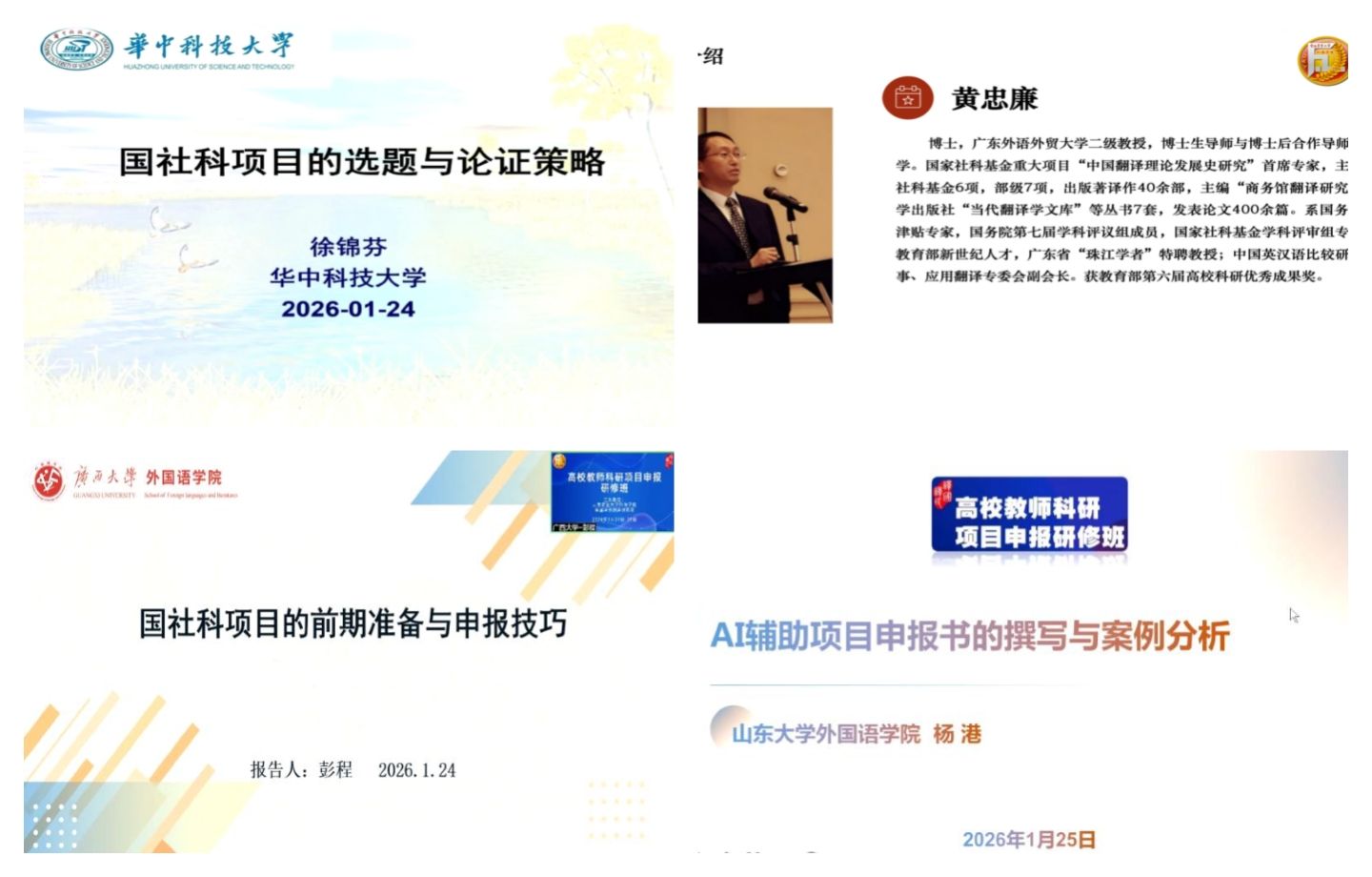 研修過程中,華中科技大學(xué)外國(guó)語學(xué)院徐錦芬教授,廣西大學(xué)外國(guó)語學(xué)院彭程教授,山東大學(xué)外國(guó)語學(xué)院楊港副教授,廣東外語外貿(mào)大學(xué)高級(jí)翻譯學(xué)院黃忠廉教授分別以《國(guó)社科項(xiàng)目的選題策略與論證方法》《國(guó)社科項(xiàng)目的前期準(zhǔn)備與申報(bào)技巧》《AI輔助項(xiàng)目申報(bào)書的撰寫與案例分析》《望聞問切,報(bào)項(xiàng)例話》為題,深入講解國(guó)社科項(xiàng)目基本情況、最新動(dòng)態(tài)和學(xué)科熱點(diǎn)與前沿識(shí)別路徑,并聚焦項(xiàng)目申報(bào)的精準(zhǔn)診斷與優(yōu)化,深度講解項(xiàng)目申報(bào)書的核心要素與潛在問題。