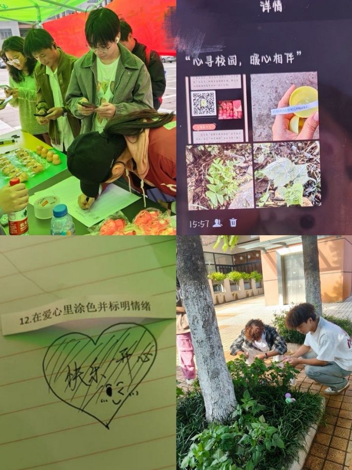 此次活動(dòng)以“趣味探索+情緒互動(dòng)”為主線,參與同學(xué)根據(jù)線索在校園中尋找任務(wù)小球,既支持個(gè)人探索,也鼓勵(lì)團(tuán)隊(duì)協(xié)作,完成包括“用樹葉拼心形”“尋找‘笑臉’井蓋”“雙人比心框景”等52項(xiàng)創(chuàng)意任務(wù),并通過(guò)拍照、分享朋友圈等方式記錄過(guò)程。活動(dòng)攤位還提供情緒互動(dòng)角,同學(xué)們可在愛(ài)心卡片上涂色、書寫心情與成就,或折疊愛(ài)心傳遞溫暖,有效增進(jìn)了大家的交流與情感聯(lián)結(jié)。此外,現(xiàn)場(chǎng)還設(shè)置了“朋友圈集贊贏好禮”環(huán)節(jié),激發(fā)了同學(xué)們的參與熱情。今后心理健康教育與咨詢中心將持續(xù)開展更多兼具趣味性與治愈特色的心理活動(dòng),為同學(xué)們的校園生活注入溫暖與活力。
